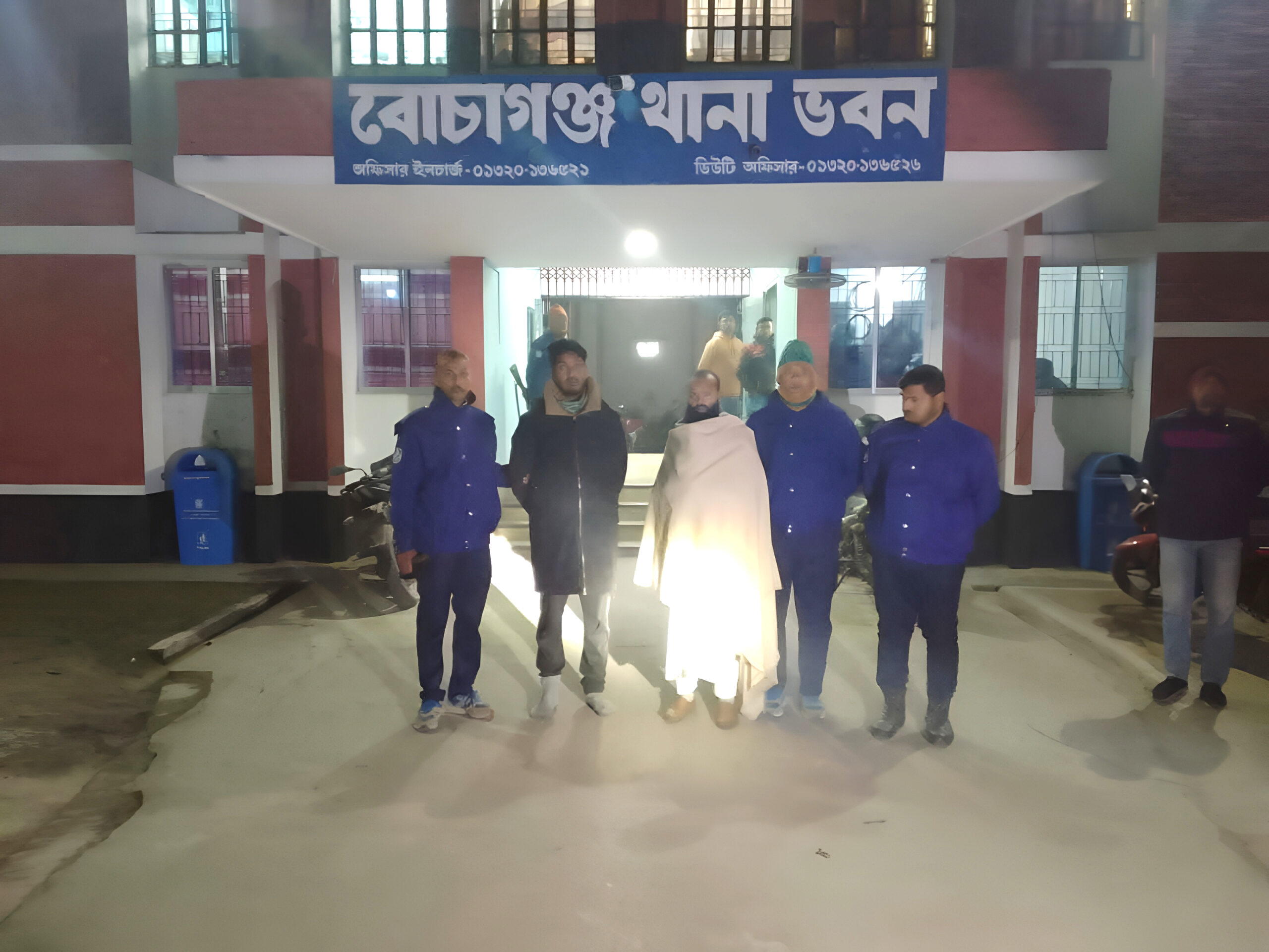বোচাগঞ্জ থানার অফিসার ইনচার্জ (ওসি)মো. মিজানুর রহমান জানান,চাঁদাবাজির সময় স্থানীয় লোকজন এজাহার ভূক্ত বিবাদীদের আটক করে। পরে এ ঘটনায় একটি মামলা রুজু করা হয়। মামলাটি নম্বর–২, তারিখ ০৪-০১-২৬। বিষয়টি তদন্তাধীন রয়েছে।তাদেরকে আদালতে সোপর্দ করা হয়েছে।
